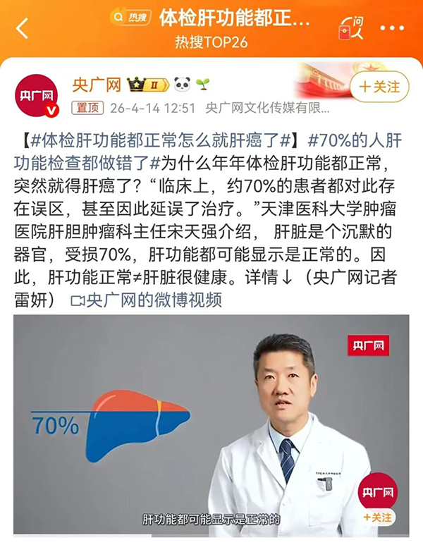 近日,央广网发布了一则话题新闻,“体检肝功能都正常怎么就肝癌了”