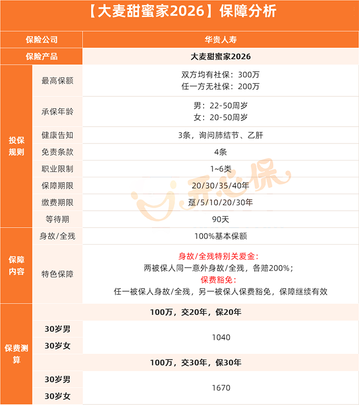今天要介绍的这款产品——华贵大麦甜蜜家2026定期寿险,是专为夫妻设计,用一张保单为双收入家庭构筑起一道坚实的风险屏障。