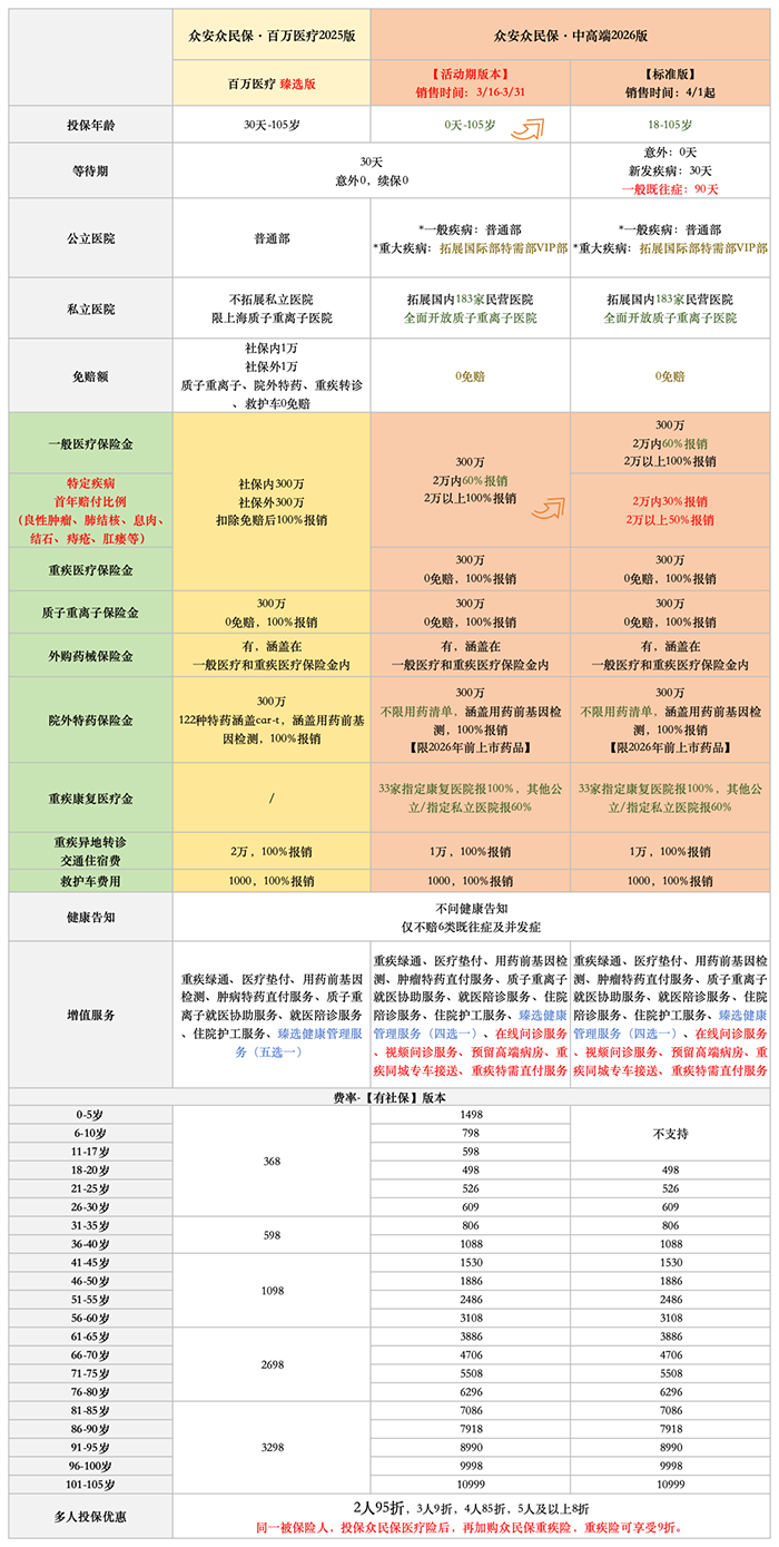 最近众安众民保的动作可算是不小,不仅推出了保障更全的“2026标准版”,还特别设定了3月16日至31日的“限时活动版”作为过渡红利期。之前关注这款产品但没有投保成功的小伙伴,这次可以重点关注一下了。