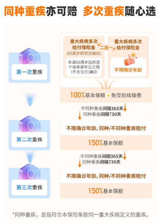 重疾多次赔: 分为两个方案(65周岁前触发或终身有效),第2、3次重疾每次赔付150%基本保额,不同重疾间隔1年,同种重疾间隔2年。