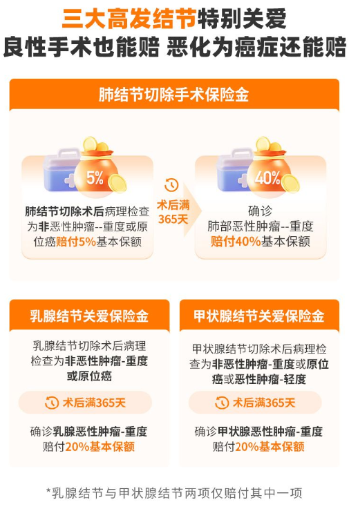 三大结节特定保险金: 肺结节切除术后病理为良性,赔付5%基本保额,术后满1年确诊肺癌额外赔付40%基本保额;乳腺结节或甲状腺结节切除术后病理为良性,术后满1年确诊对应部位癌症,额外赔付20%基本保额。